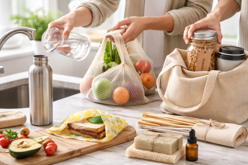 Reusable water bottles, grocery bags, or beeswax wraps are easy entry points.